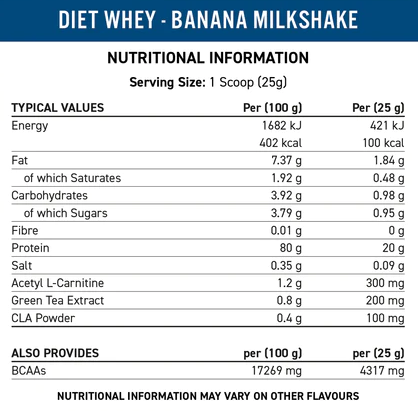 H πρωτείνη της Applied, Diet Whey είναι μακράν το πιο προηγμένο διαθέσιμο συμπλήρωμα διαχείρισης βάρους, συνδυάζοντας όλα τα βασικά συστατικά που είναι σήμερα γνωστό ότι συμβάλλουν στη διαχείριση βάρους, συμπεριλαμβανομένων των CLA, L-Carnitine, Green Tea, Whey Protein Isolate & Whey Protein Concentrate με αποτέλεσμα εξαιρετικά χαμηλό μείγμα υδατανθράκων υψηλής πρωτεΐνης. Ενώ εστιάζουμε πρωταρχικά στη συγκεντρωση όλων των ζωτικών θρεπτικών συστατικών, καταφέραμε να δημιουργήσουμε ένα καταπληκτικό γευστικό συμπλήρωμα κατάλληλο για όσους αναζητούν μια πιο απλοϊκή προσέγγιση στη διαδικασία διαχείρισης βάρους.