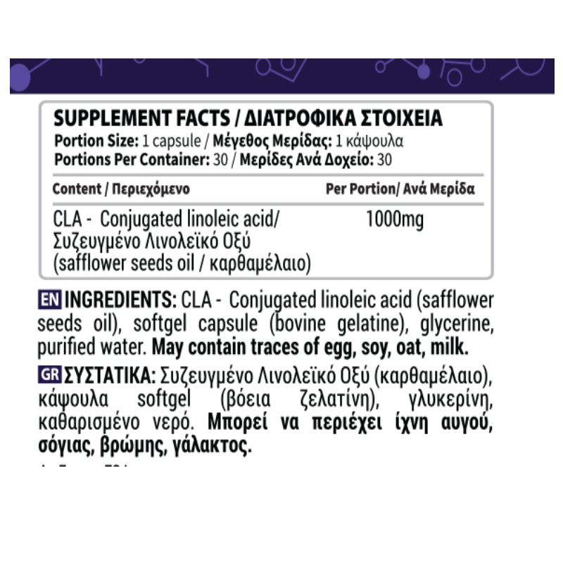 Συστατικά: Συζευγμένο Λινολεϊκό Οξύ (1000mg), κέλυφος κάψουλας (ζελατίνη, γλυκερίνη), καθαρό νερό.