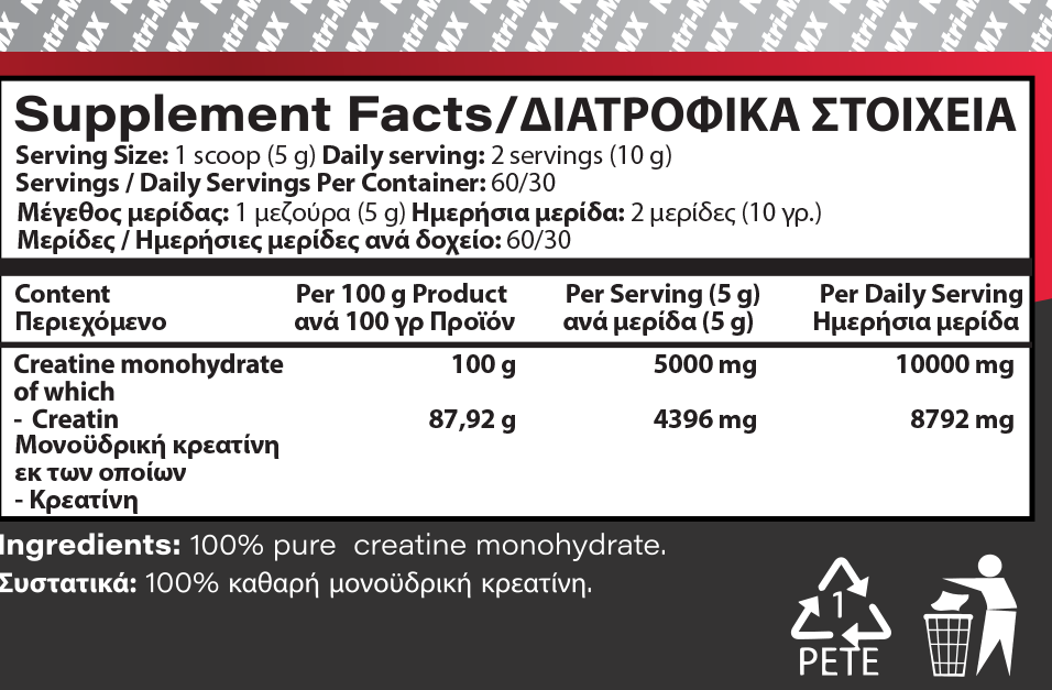 Η καθαρότητα της πρώτης ύλης είναι ο σημαντικότερος παράγοντας όταν επιλέγετε ένα συμπλήρωμα κρεατίνης. Η Creatine Monohydrate της Nutri-MX ξεχωρίζει γιατί διαλύεται εύκολα σε νερό ή χυμό, χωρίς να αφήνει ιζήματα, γεγονός που την καθιστά ιδιαίτερα φιλική προς το πεπτικό σύστημα. Η απουσία πρόσθετων γεύσεων ή χημικών γλυκαντικών σας επιτρέπει να την αναμίξετε με το αγαπημένο σας pre-workout ή το μεταπροπονητικό σας ρόφημα πρωτεΐνης χωρίς να επηρεαστεί η γεύση.