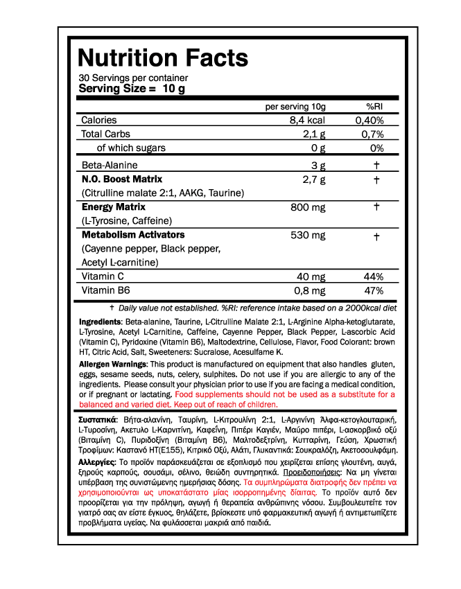 To pumpamental Pre workout έχει σχεδιαστεί για να σου δώσει το boost που χρειάζεσαι ακριβώς πριν την προπόνηση σου. H φόρμουλα του περιέχει προσεκτικά επιλεγμένα συστατικά που συνεισφέρουν στη βελτίωση της ενέργειας, της αντοχής και του μυϊκού Pump.