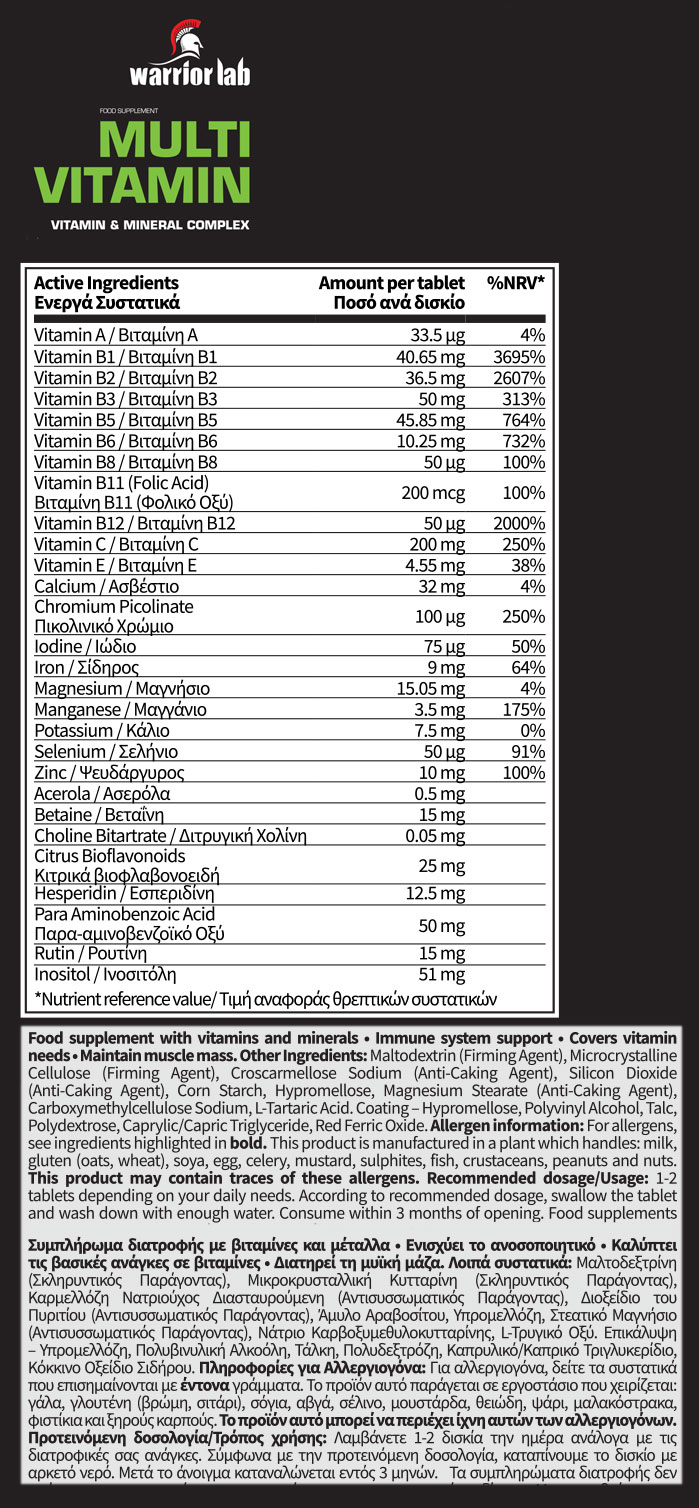 Με τη Multivitamin της Warriorlab, το σώμα γεμίζει “καύσιμα” για να λειτουργεί στο μέγιστο. Από τις πρώτες μέρες παρατηρείς περισσότερη ενέργεια, λιγότερη κόπωση και καλύτερη απόκριση στα υπόλοιπα συμπληρώματα.